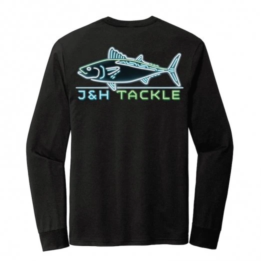 The J&H Tackle Neon Albie Long Sleeve T-Shirt is available in M-3XL in black. Get one for yourself and anyone you know who loves that zip sound when you hook an albie and it takes off.Â