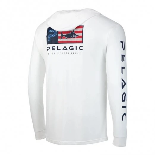 The Pelagic Aquatek Icon Long Sleeve Performance Hoody is a wonderful fishing shirt. It’s got a really soft feel to it that feels nice against your skin. This is a performance shirt with a hoody that will provide extra sun protection than if you just had a shirt. It features a loose cut for extra comfort when you are fighting a big tuna! The Aquatek Icon provides UPF 50+ sun protection, wicks moisture away from your skin to keep you cool and has vented underarms for additional cooling. There really is nothing worse than overheating while you are on the water. It saps your energy and that means less fishing. The hoody is stain resistant and antimicrobial so you’ll be able to keep it clean and in good condition for a long time. The shirt itself is white with an Americamo graphic on the rear, a classic Pelagic logo on the front left chest and Pelagic down the right arm. It’s a clean look with a little bit of flair that will let everyone on the boat or at the beach know that you are passionate about offshore fishing. If you’re looking for a new fishing shirt that is going to perform as god as it looks, buy a Pelagic Aquatek Icon Long Sleeve Performance Hoody.